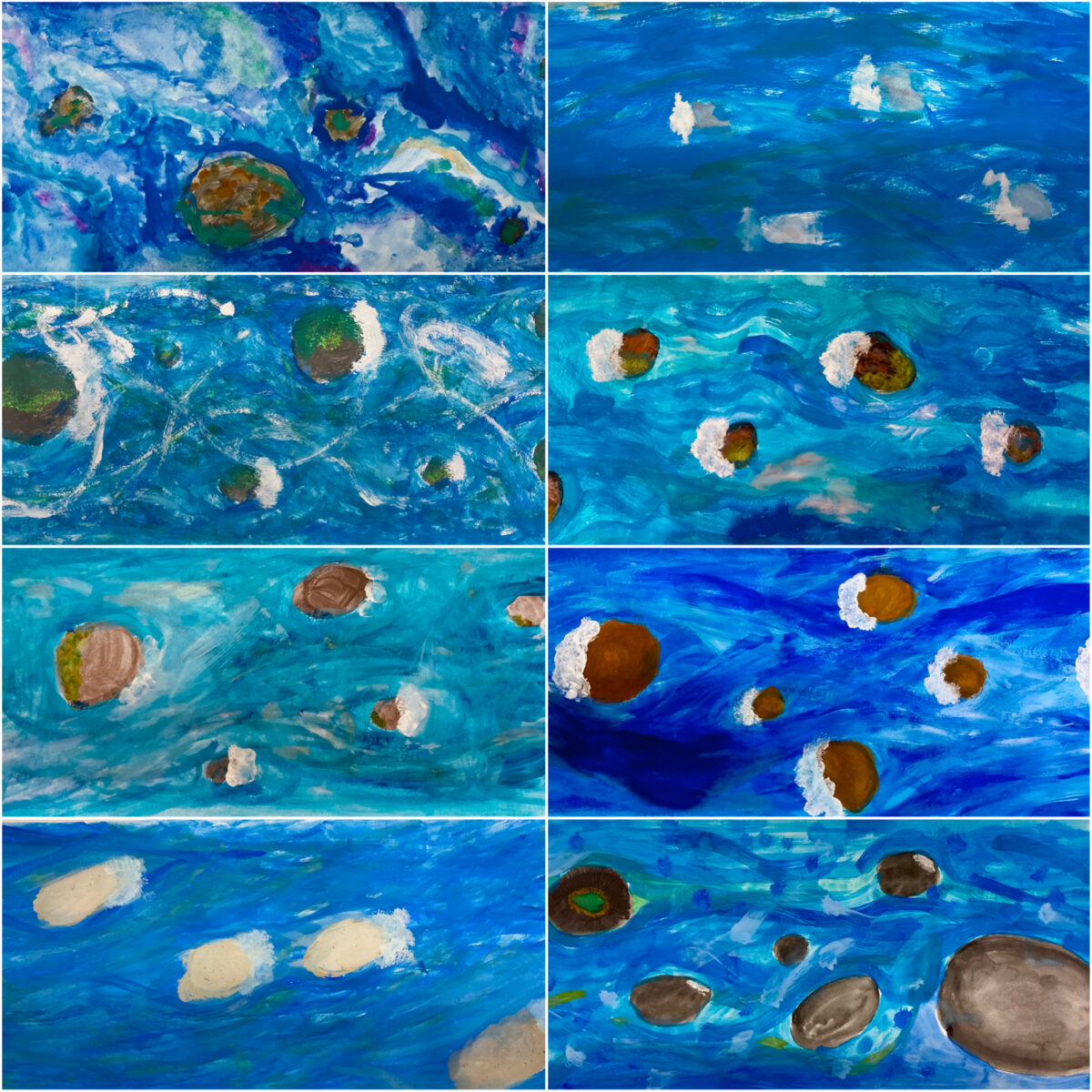 Mit dem eigenen Pinselduktus Striche ziehen, Tupfen setzen, Wellen formen, die Fließrichtung darstellen und die Farbe Blau in ihren vielfältigen Farbnuancen mischen ist den Klassen 5 bei dieser Aufgabe gelungen.