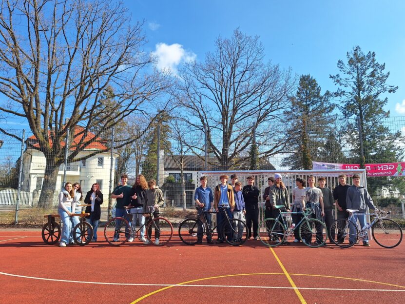 Die Schüler:innen konnten die verschiedenen Fahrräder auf dem Spielfeld vor dem SG testen. Sie ordneten die Räder in chronologischer Abfolge und versuchten das jeweilige Baujahr zu schätzen . Abschließend überlegte sich die Gruppe, welchen Verwendungszweck die verschiedenen Fahrräder hatten, und diskutierte, welche technischen und gesellschaftlichen Veränderungen ihrer Zeit auch an den Fahrrädern sichtbar werden.
