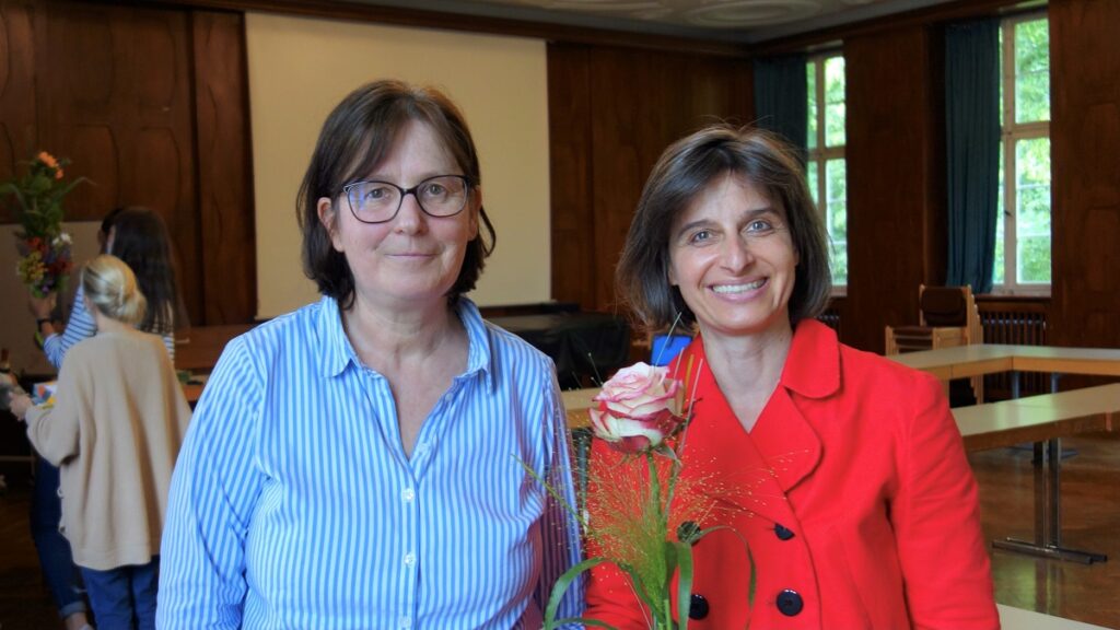 15.07.2021: Schulleiterin Christiane Dittmann freut sich, dass sich Simone Robitschko seit diesem Schuljahr im Schulleitungsteam engagiert, und gratuliert nachträglich zur Beförderung zur Studiendirektorin.