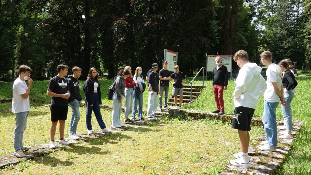 17.07.2021: „Hier war einmal die Straße ins römische Reiterkastell.“ — KMD Thomas Haller führt die Schüler:innen des ev. Relikurses 10ab in die 1.200-jährige Geschichte von St. Johann, der ältesten Aalener Kirche, ein.