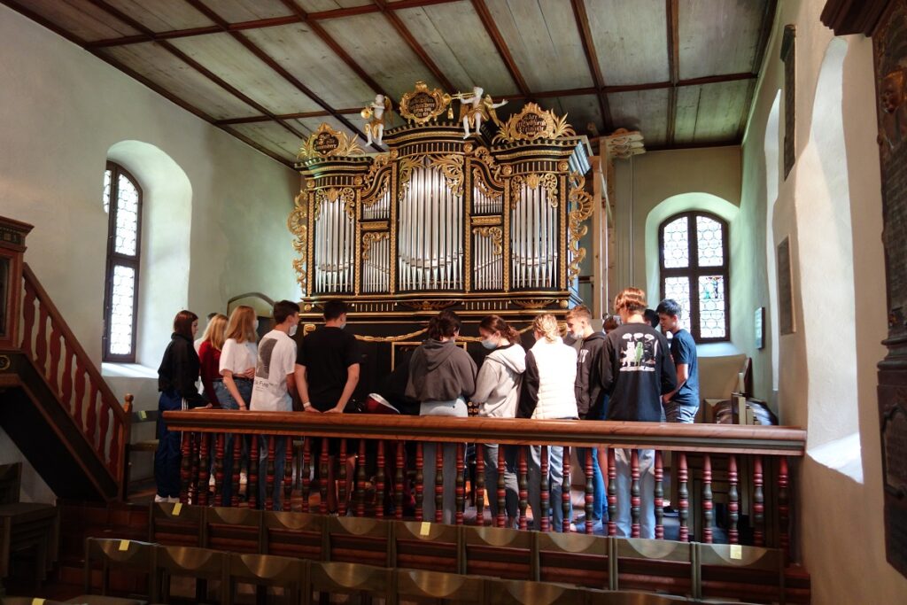 17.07.2021: „Ins Wasser fällt ein Stein“ Schüler:innen des ev. Relikurses 10ab sind begeistert vom Orgelspiel von Kirchenmusikdirektor Thomas Haller — und vergessen darüber glatt den Blasebalg der renovierten Allgeyer-Orgel (1802) zu betätigen!