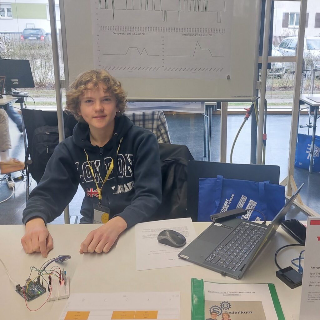 04.03.2023: Nils Neumeister und Igor Sidorenko programmierten einen Arduino, der die Temperatur mit einem Temperatur-Feuchtigkeitssensor misst.