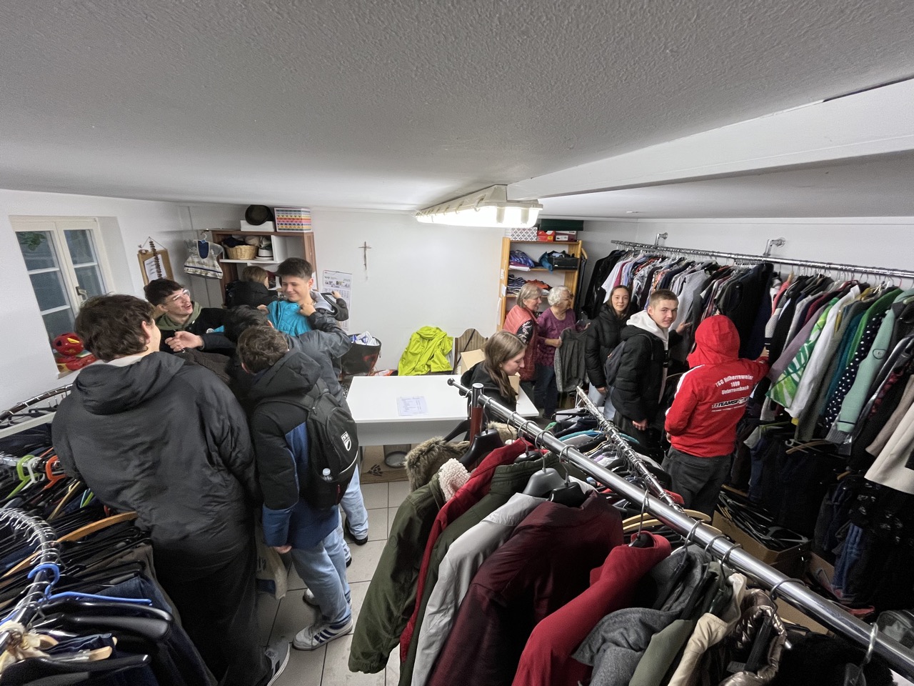 Umwelttag, 23.10.2025: Schüler:innen der Klassen 10 interessieren sich für Second-Hand Kleider in der ökumenischen Kleiderstelle in Ellwangen. Eindrückliches ehrenamtliches Engagement!