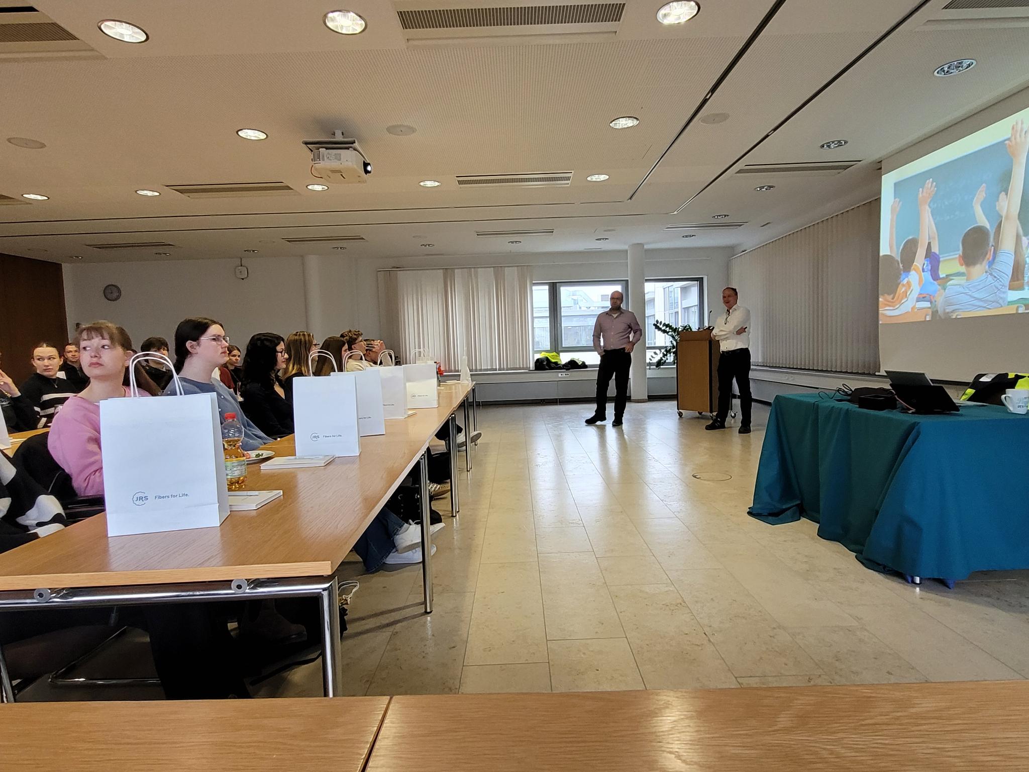 Zu Beginn erhielten die SuS einen spannenden und informativen Vortrag über die strategische Ausrichtung des Unternehmens. Schnell wurde deutlich, dass das weit verbreitete Klischee eines klassischen Sägewerks hier nicht zutrifft. Stattdessen präsentierte sich JRS als innovatives, international tätiges Unternehmen mit vielfältigen Einsatzbereichen seiner Produkte.