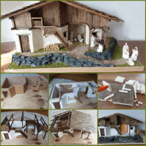 Eine besondere fachpraktische GFS präsentierte Elias Eberhard in diesem Jahr – seine selbstgebaute Weihnachtskrippe. In vielen Stunden Arbeit entstand aus Leichtbauplatten das Untergeschoss, das er sorgfältig verputzte und ein Obergeschoss aus Holz. Mehr als 400 Dachschindeln schnitt er einzeln zu, fertigte aus Dosenblech ein Türscharnier, trocknete Moos und zerkleinerte es, bereitete Brennholz in Miniaturform und viele weitere liebevolle Details vor. > > Das Ergebnis ist eine beeindruckende, handgefertigte Weihnachtskrippe. In seinem Vortrag vermittelte Elias zudem umfangreiches Wissen zur Geschichte der Krippenkunst und über die verschiedenen Krippenstile.