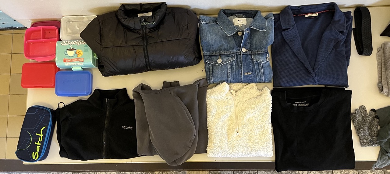 Fundsachen finden Sie in einer Box rechts vor dem Sekretariat. In regelmäßigen Abständen veröffentlichen wir Bilder und legen Fundsachen auch im südlichen Foyer aus. Wertsachen (Handys, Fahrkarten, Geldbeutel…) bewahren wir im Sekretariat auf.