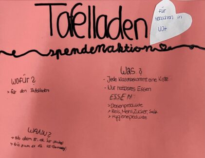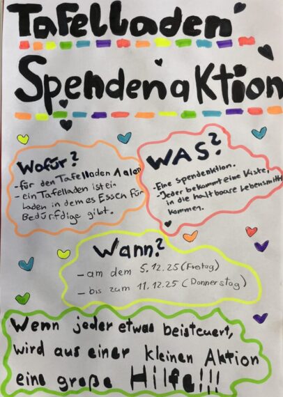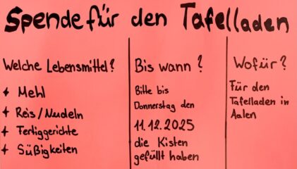 SMV und Reli-Ethik-Gruppen organisieren eine Sammelaktion für den Tafelladen: Am Fr., 05.12., erhalten die Klassen 5-10 ihre Kisten für die Sammelaktion für den Tafelladen. Wir bitten die Familien, den Schüler:innen haltbare Lebensmittel und andere Dinge des täglichen Gebrauchs für die Tafel mitzugeben. Weil die Versorgung der Tafelläden zur Zeit angespannt ist, freut sich auch die Aalener Tafel sehr über Ihre Spende. Am Do., 11.12., holen die Mitarbeitenden vom Tafelladen die Kisten ab. Vielen Dank für Ihre freiwillige Spende! | Liste mit gefragten Spenden